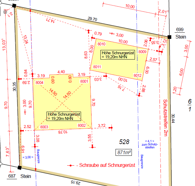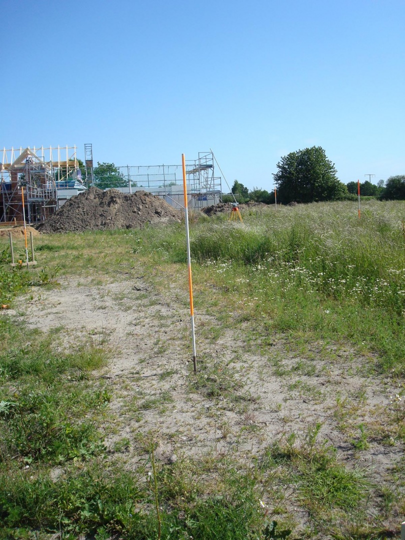 Heute wurde gemeinsam mit dem Vermessungsbüro, Tiefbauer und Bauunternehmer die Einmessung des Baukörpers vorgenommen. Ideal war das Wetter, bester Sonnerschein. Diesen Termin sollte man aufjedenfall wahrnehmen, denn es ist das erste Mal, dass man die Grundrisse anhand von Schnüren auf dem Grundstück sieht. Man bekommt hierdurch schonmal eine erste Proportion des gesamten Vorhabens.
